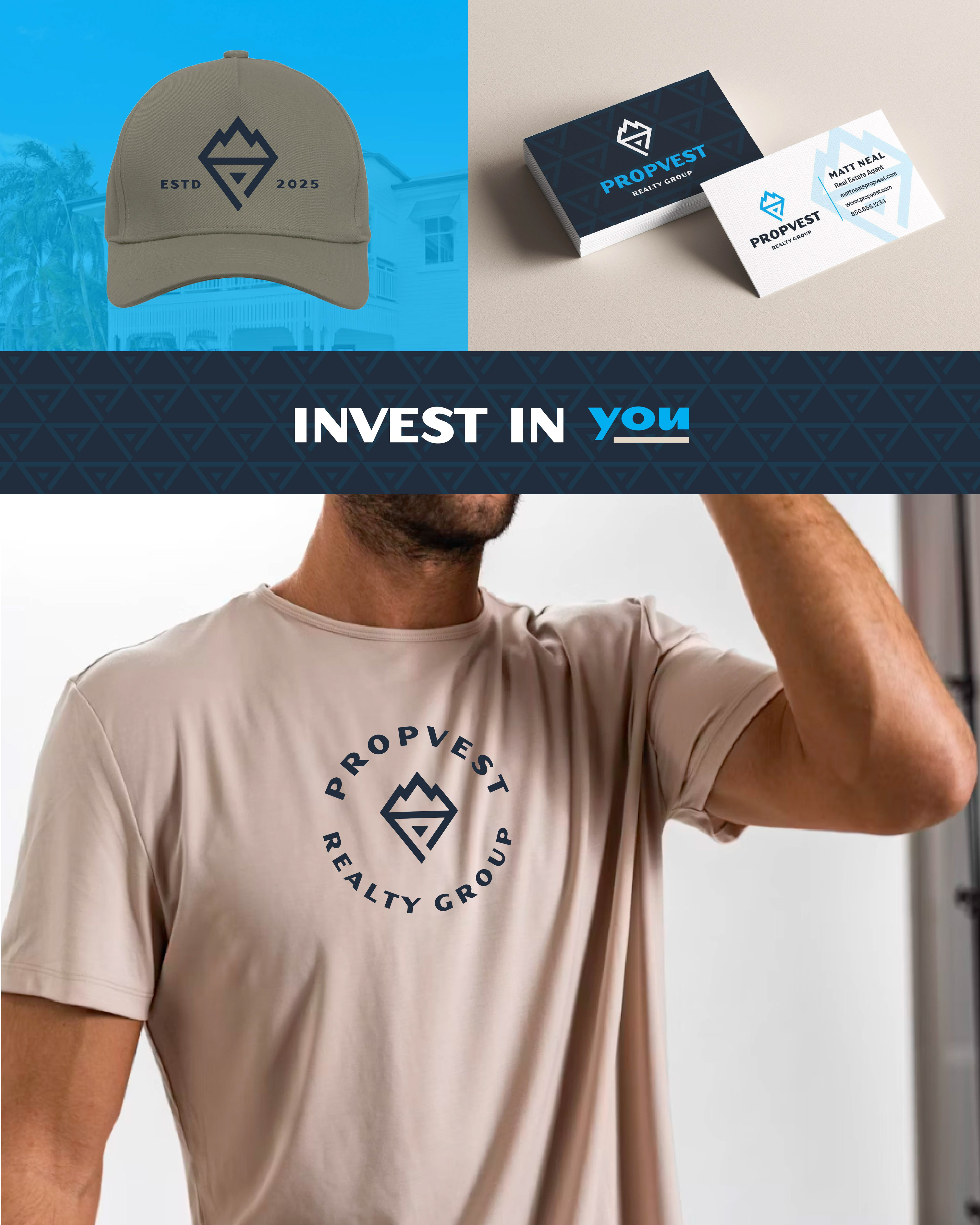 Potential logomark and branding package for a Property Group that wanted to stand out from their competitors as bold and fresh. The client needed to be unique and recognizable right away. By using the letter "P" as the anchor for the logo, we began to build on what makes the client special. By combining the letter P with mountains and a torch symbol, this logo mark signifies stability, growth, life and energy.